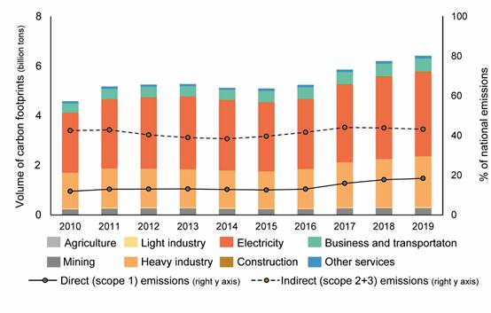 研究结果显示,针对电力和重工业企业温室气体排放的减缓行动对于减少上市企业的碳足迹也至关重要。中国上市企业碳足迹总量中超过一半(52.9%)均来自电力生产行业,其次是重工业(32.0%)