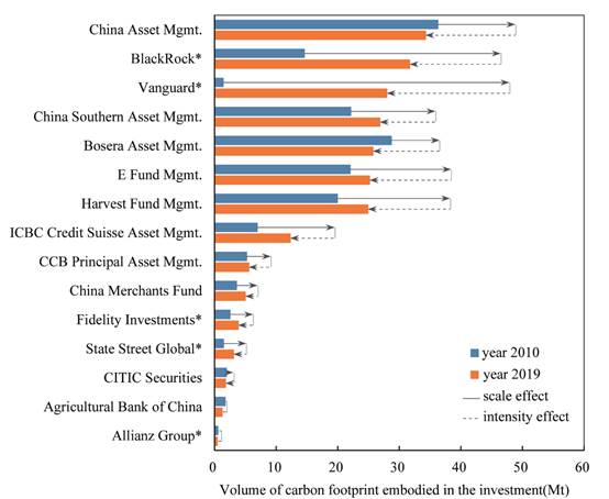 上市企业价值链碳足迹信息还能够为资产管理机构的投资策略提供依据。近年来,投资者愈加关注其投资活动的环境影响,投资低碳企业可以有效控制其面临的气候风险。研究估算了全球及全国领先的资产管理机构在中国股票市场的股权投资组合的融资排放,结果显示,与过去十年相比,大多数资产管理机构的融资排放均有增加。然而,由于中国股市在过去10年向国际投资开放,海外资产管理机构投资中国股市所隐含的排放增长更快。