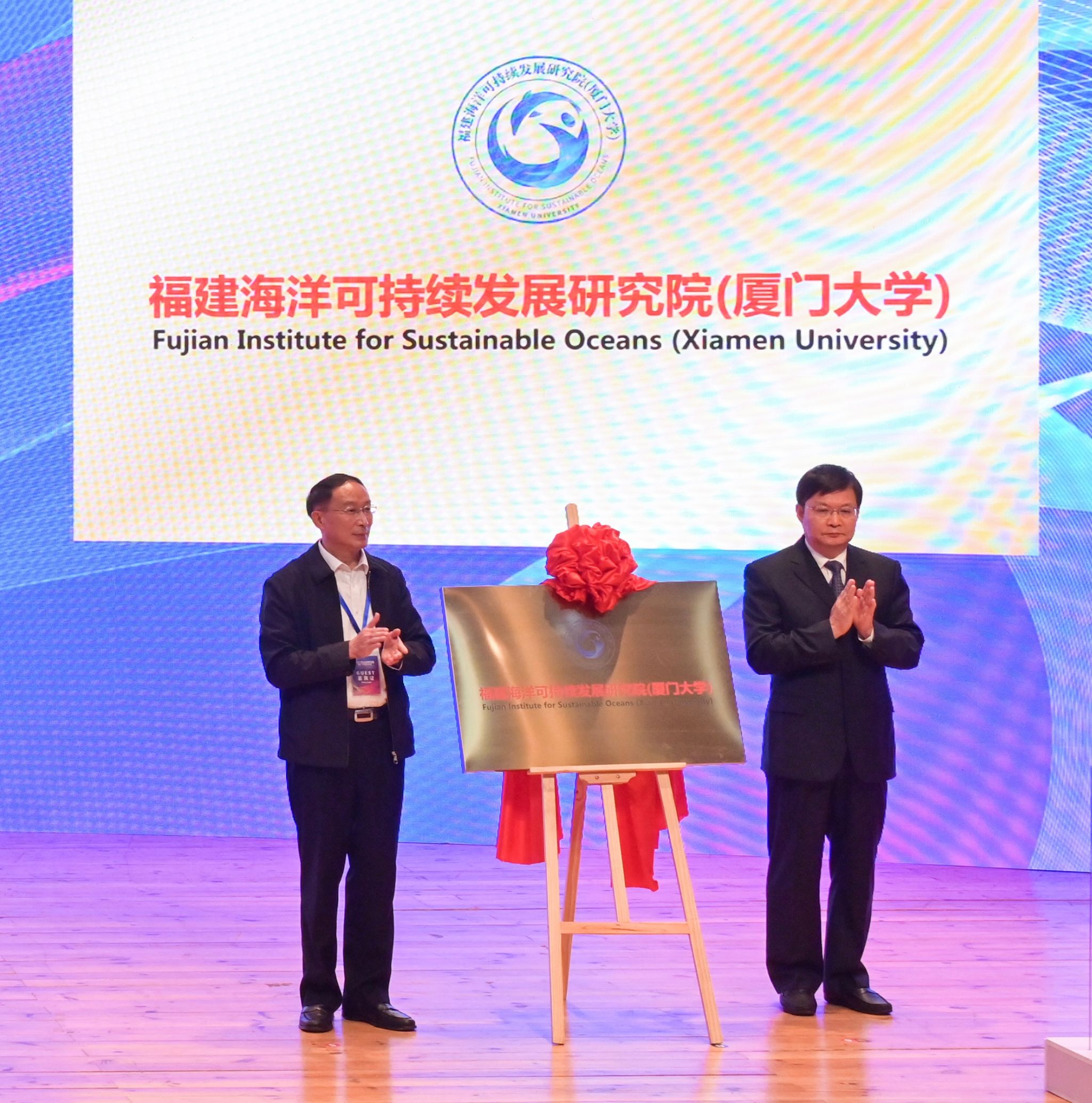 在上午举行的开幕式上,由福建省海洋与渔业局、厦门市海洋发展局和厦门大学三方共建的福建海洋可持续发展研究院(厦门大学)(下称“闽海院”)举行了揭牌仪式,福建省海洋与渔业局二级巡视员江和泉、厦门市海洋发展局总工程师林怀远共同为闽海院揭牌。于2020年2月正式落地厦大,闽海院依托厦门大学地球科学与技术学部,是基于厦大海洋、生态等一流学科,整合多个涉海自然科学与社会科学,以海洋智库为主要特色的省级多学科交叉科技平台,是福建海洋创新实验室(筹)先行先试的重要组成部分。