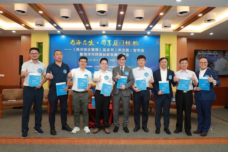 On June 8th, 2020, a press conference on the Blue Book “Integrated Marine Management” (Chinese version) themed “Living with the Sea - Sharing Xiamen Experience” and the Cloud Summit on Marine Sustainable Innovative Development was held in Xiamen University (XMU) as theme activities of the World Oceans Day. One of the lead authors of the Blue Book and Academician of Chinese Academy of Sciences Prof. Dai Minhan, Secretary General of China Oceanic Development Foundation (CODF) Prof. Pan Xinchun, Chief Engineer of Xiamen Municipal Bureau of Ocean Development Mr. Lin Huaiyuan, Chief Planner of Xiamen Municipal Bureau of Natural Resources and Planning Mr. Shen Ruiquan, Coordinator General of Fujian Institute for Sustainable Oceans (FISO) Prof. Xue Xiongzhi, Vice President of Shanghai Zhenhua Heavy Industries Co., Ltd. Mr. Chen Bin, Vice President of the Paradise International Foundation Mr. Ma Jian, 70.8 Media Lab Prof. You Weiwei were invited to introduce the main contents of the Blue Book and share the experience of integrated coastal management and achievements of blue economy development in Xiamen. They also held an in-depth discussion on the topic of innovative sustainable ocean development.