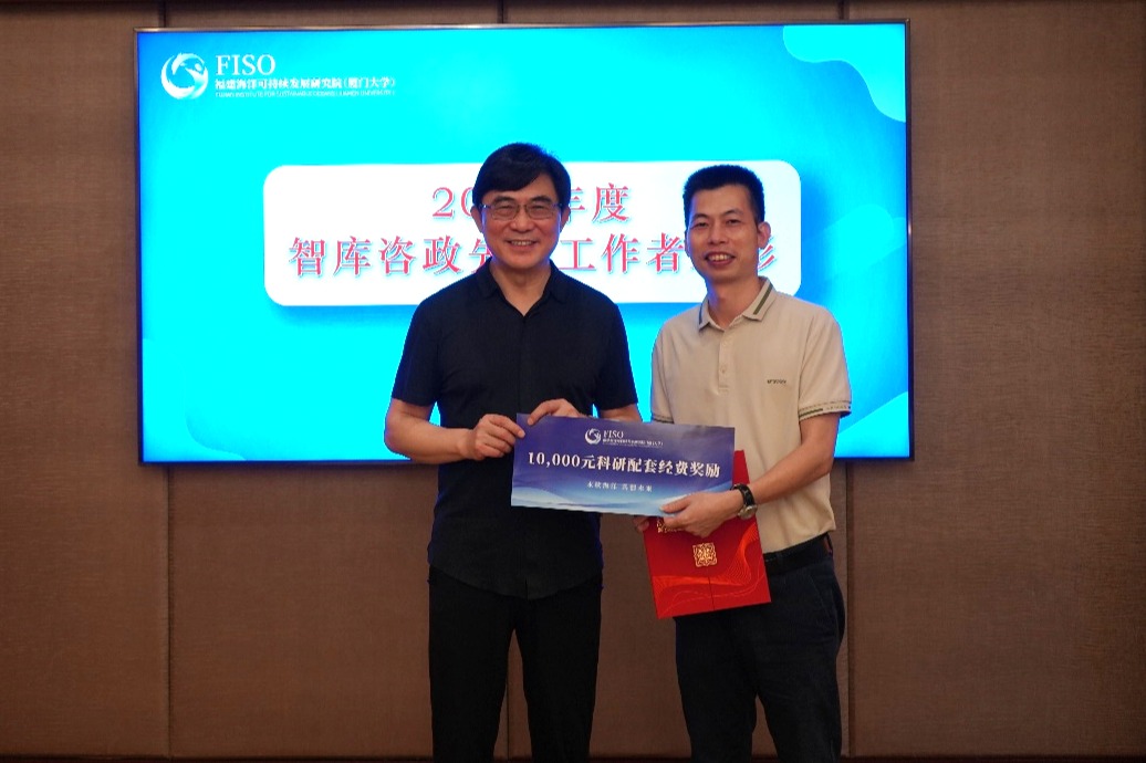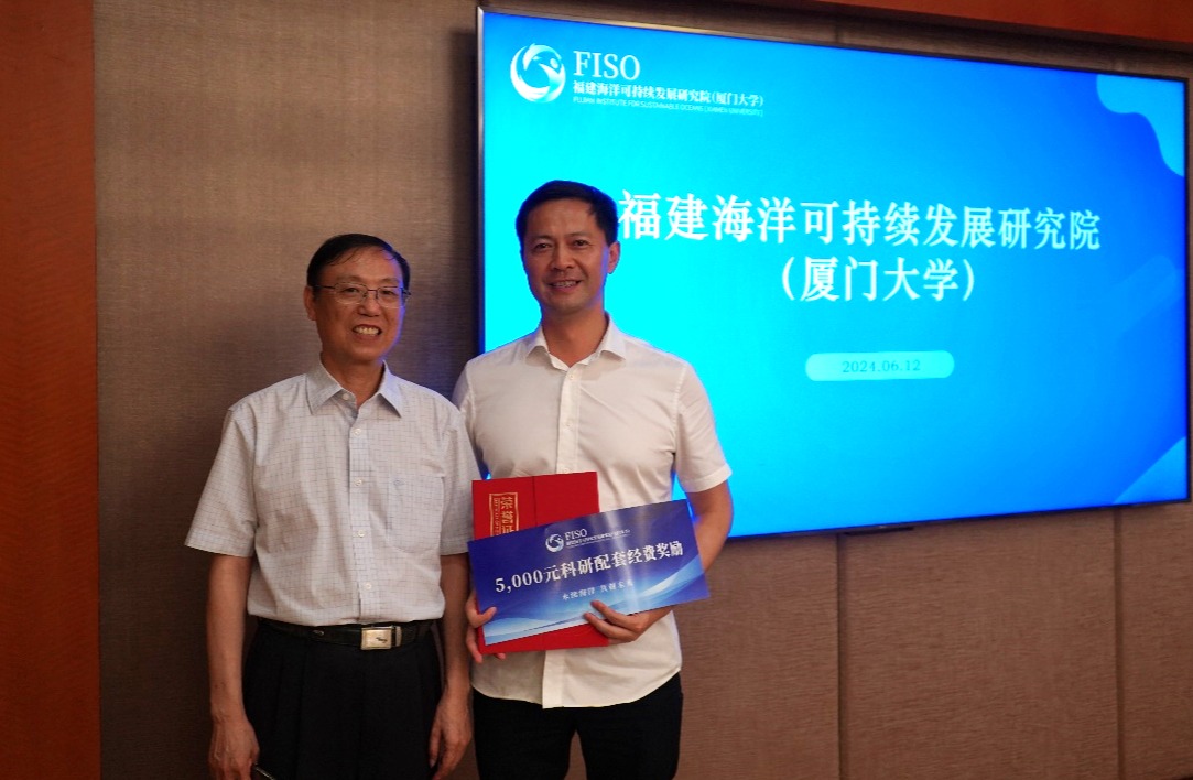 之后进行的是闽海院“2023年度智库咨政先进工作者”表彰环节。根据《福建海洋可持续发展研究院(厦门大学)咨政先进工作者评选管理办法》,2023年度,闽海院共有三名成员获得“一类智库咨政先进工作者”称号,分别是施余兵教授、孙传旺教授和苏清海特约研究员,并分别获得10,000元科研配套经费奖励;陈能汪教授获得“二类智库咨政先进工作者”称号,并获得5,000元科研配套经费奖励。戴民汉院士和薛雄志教授为获奖者颁发了荣誉证书。薛雄志教授表示,作为海洋智库,闽海院的核心任务之一是发挥厦门大学多学科优势和实力,积极将科学研究成果转换为政策建议,为各类海洋管理部门提供科技支持。未来,闽海院将继续努力,提供更多前瞻性的咨政报告,助力海洋强国建设和“一带一路”倡议的推进。