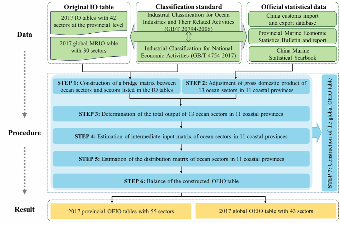 We constructed the OEIO datasets of China's coastal province in 2017, based on the official provincial IO tables published by the National Bureau of Statistics and the global MRIO table published by OECD that contains Chinese provinces. The processes of separating the characteristics of the ocean economy entail seven key steps: (1) We constructed a bridge matrix linking 13 ocean sectors with 42 sectors listed in the provincial IO tables based on Industrial Classification for Ocean Industries and Their Related Activities (GB/T 20794-2006) and Industrial Classification for National Economic Activities (GB/T 4754-2017). (2) We collected the gross domestic product of ocean economy at the sectoral and provincial level respectively, and adjusted the data to maintain consistency in total values. (3) We estimated the total outputs of ocean sectors in coastal provinces based on the gross domestic product and value-added rates derived from micro-level enterprise data. (4) We estimated the intermediate input matrix of ocean sectors based on the stripping coefficients, which are calculated as the ratio of the output of ocean sectors to the output of corresponding sectors in the official IO tables. (5) We estimated the distribution matrix of ocean sectors in coastal provinces based on the stripping coefficients calculated in the previous step. (6) We adopted the RAS method to balance the constructed provincial OEIO tables. (7) We repeated the above steps to differentiate the Chinese ocean sectors in a global MRIO table that contains Chinese provinces.